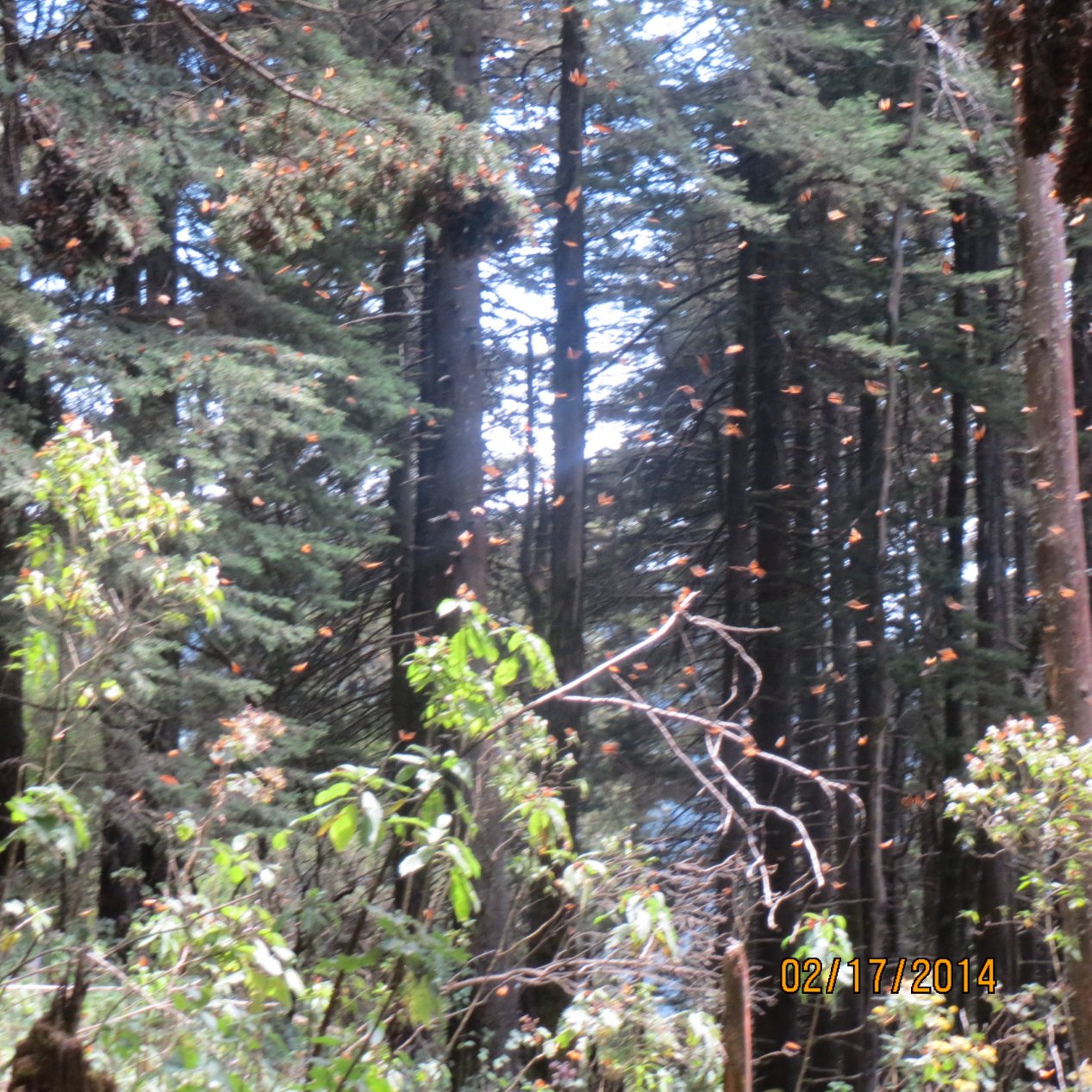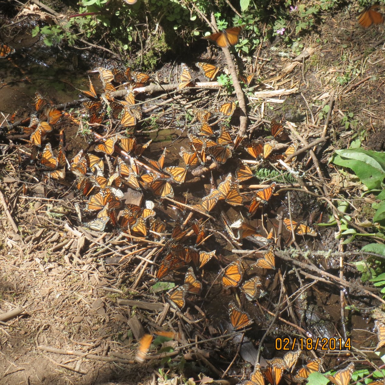At 10am we were off for our second butterfly sighting this time at the most popular and developed sanctuary of El Rosario. A little before noon we arrived at the main parking lot for El Rosario (we were the only tourists) and headed up a paved path for about 1.7 miles and elevation gain of 820 feet to an altitude of 10,700 feet. We arrived in time to see the little critters swarming from their trees to look for water, nectar and, most important, mates. I rudely took a few photos of them coupling on the ground.