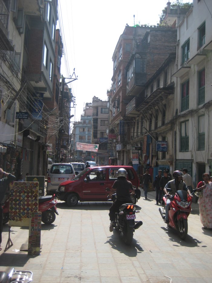 The van ride from the airport to our Hotel Vaishali gave us our first introduction to Kathmandu traffic and road conditions. Vehicles drive more or less on the left hand side and the main requirement is a good horn (brakes are optional, I guess). Beeping horns mean get out of the way (especially pedestrians) and blinking headlights mean a head-on collision is imminent unless someone swerves over.