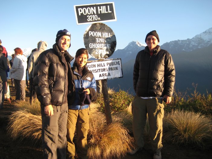 I recovered during the night and was ready for our 4:30am departure for the famed "Poon Hill" which is about a one hour hike and 1500 foot elevation gain to the west of Ghorepani. Poon Hill (Poon is apparently a family name) provides a great point for viewing the sun rise across a spectacular panorama of Himalayan peaks. Fortunately, we had clear skies and shared the marvelous view with several hundred other trekkers who come every morning for the event.