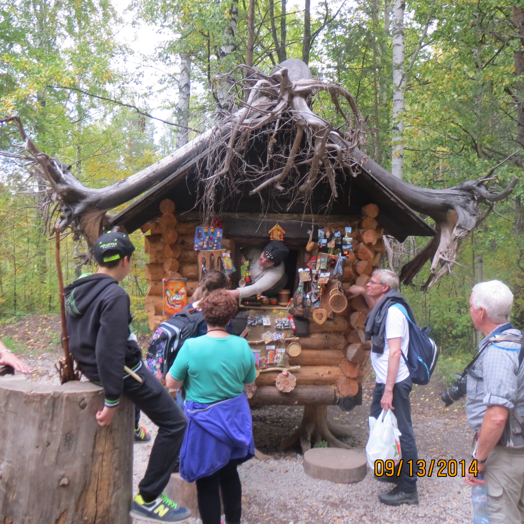 We endured a major traffic jam due to some construction and, finally, arrived at the very popular "Wild Deer and Something Else(?) Park". We (including two young ladies touring from Denmark) commenced our 9 mile (?) hike through the forest of birch, larch, aspen, spruce, laurel with some nice Fall colors. There are huge ant mounds in these forest and he showed us how to take a piece of grass, lick it, place it on the mound so ants crawl on it and leave chemical deposits (ant pee?). You can then shake the ants off and taste the bitter formic acid stuff on the grass! We got photos of replicas of ancient pagan shrines, a witch's (Babayega?) house, a nice picnic lunch, views from above and later crossing the Serga River and finally back to our hotel to shower and get ready to board the train.