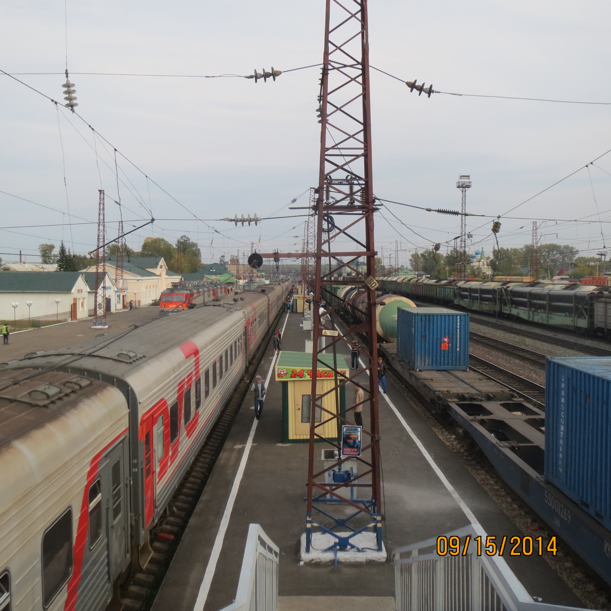 On Monday at 1115 we departed Krasnoyorsk having purchased 1.5 liter water at 65 rubles and crossed the Yenisey River which bisects east and west Siberia and is a bit more than half way to Beijing. By 1600 (MT+2) we had a stop at Ilanskaya for photos and a brief chat with a young Australian man. He said the 3rd class cars are really fun with lots of socializing and sharing of vodka, etc. We were OK with our more mature class of travel! Finally, before retiring for the night we packed our stuff to be ready for an early unloading at Irkutsk on Tuesday morning.