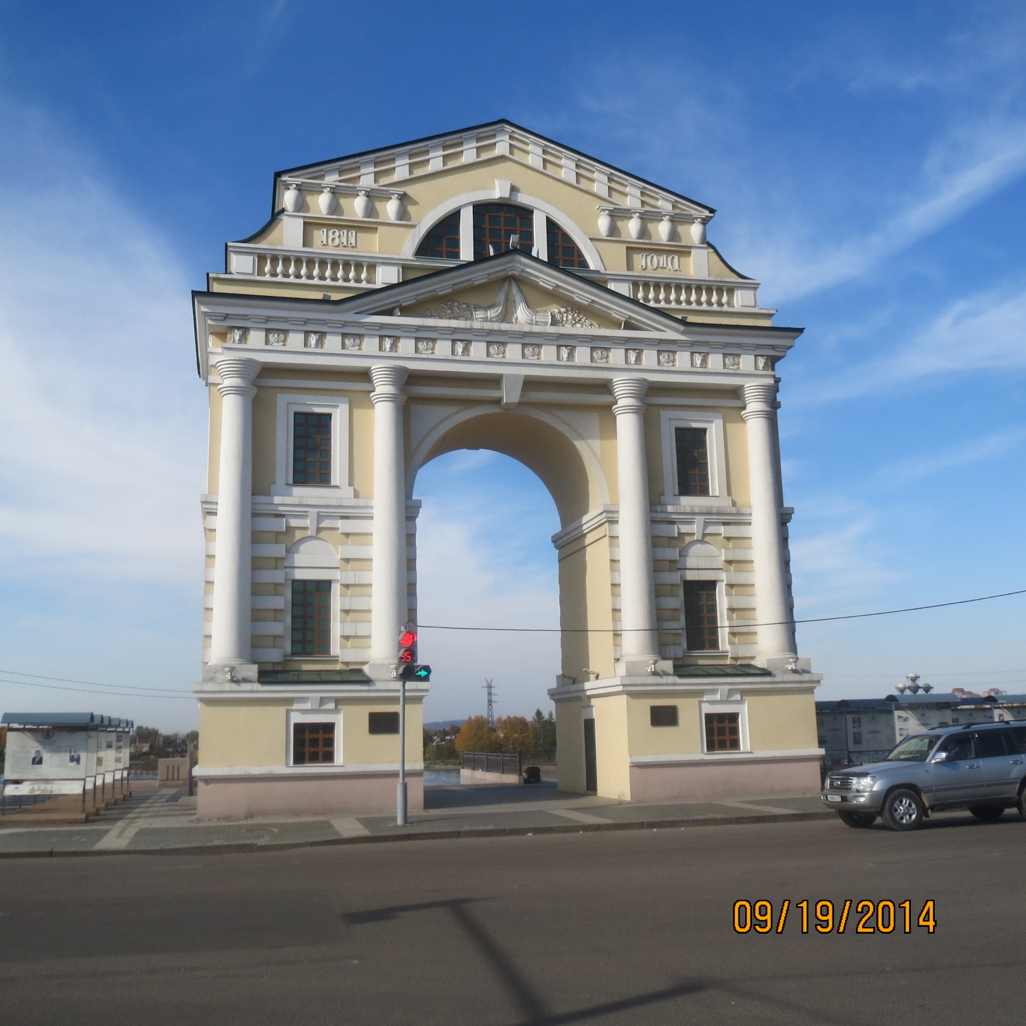 At 1215 we were checked into the Angara Hotel in Irkutsk and were surprised that our agency, TRE, had sent an English speaking man, Alexander, to briefly great us at the hotel and to recommend some restaurants and places to go. After a light lunch of tomatoes, cucumbers, beets, potatoes and, of course, cabbage we were off to explore the town. Reading the street signs was challenging but we made it to our destination to see some original Siberian-style wooden buildings and then to the edge of the Angara River. There is a "Royal Arch" at river's edge commemorating the 1891 visit to Irkutsk of Tsar Nicholas II.