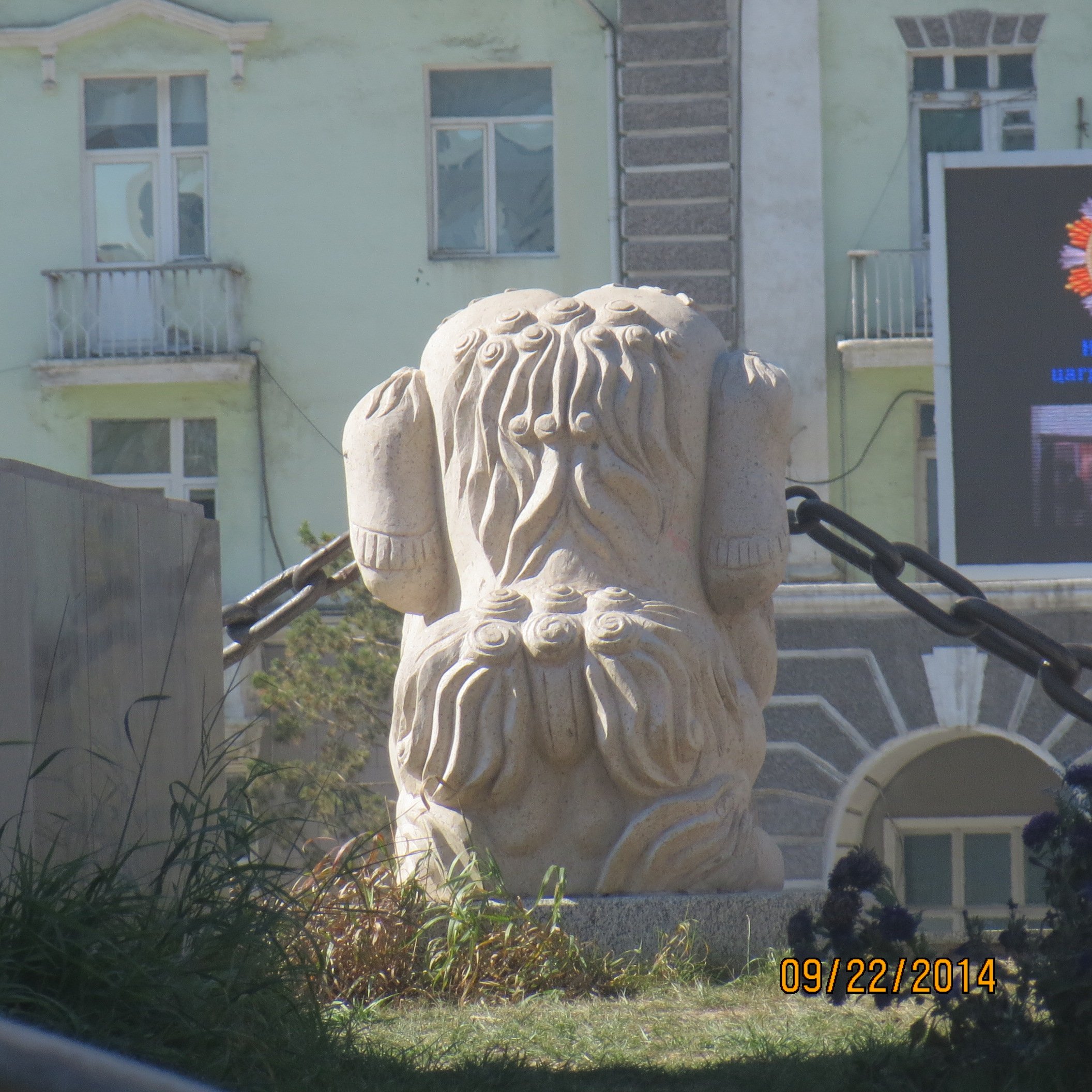We started our UB tour with a hot shower at a communal bath facility and then were off for about 6 miles of walking around town while Ulziimaa proudly told us about "my city". We learned that "in Soviet times" the city got its name of UB which means "Red hero" but since independence the Mongolians are asserting their freedoms and now have a democracy. We were told that Mongolia has a total population of about 3 million and half the population lives in UB. That means this vast country of many natural resources is very thinly populated. Buddhism is the dominant religion in Mongolia and we visited the Gandan Monastery to see a very tall goddess of compassion statue, monks doing their morning prayer chants, big incense pots and thousands of pigeons. We also learned that shamanism is a popular religion and we stopped at a nearby tent (ger) but no photos allowed inside. I did take photos of the ger, a horned totem and statue of somebody.