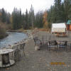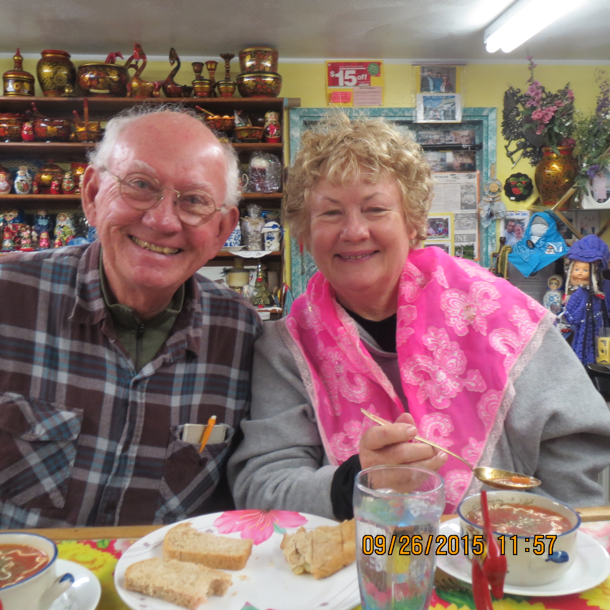 On Saturday we drove a few miles north of Homer to visit a unique Russian village of Nicolaevsk. This village is the home of a sect of "Old Believers" who had split from the Russian Orthodox church many years ago. According to my travel book the main reason for visiting is to have a meal at the Samovar Cafe. When we arrived the cafe was closed but soon a van drove up and out jumped Nina, the owner. Soon the three of us had the cafe to ourselves and after sort of negotiating some high prices Nina began preparing our meal. We were soon treated to borscht, sauerkraut, sausage, dumplings, bread, dessert and Russian tea. It was the best Russian meal I have had since Buck and I were in Russia!