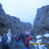 Today we had our first bus trip to the "Golden Circle" with Reykjavik Excursions. The weather was blustery and wet with temps around 40 degrees F. The Golden Circle included, first, a stop at the Thingvellir National park for a look at the locations where the world's first parliamentary forms of government arose in 930AD and, for us, an exciting chance to see the geology of the spreading zone where the Euroasian and North American tectonic plates are slowly separating. Actually, from this experience and from our later studies with relief maps I learned that the spreading is far from obvious and we must accept the geologists' interpretations.