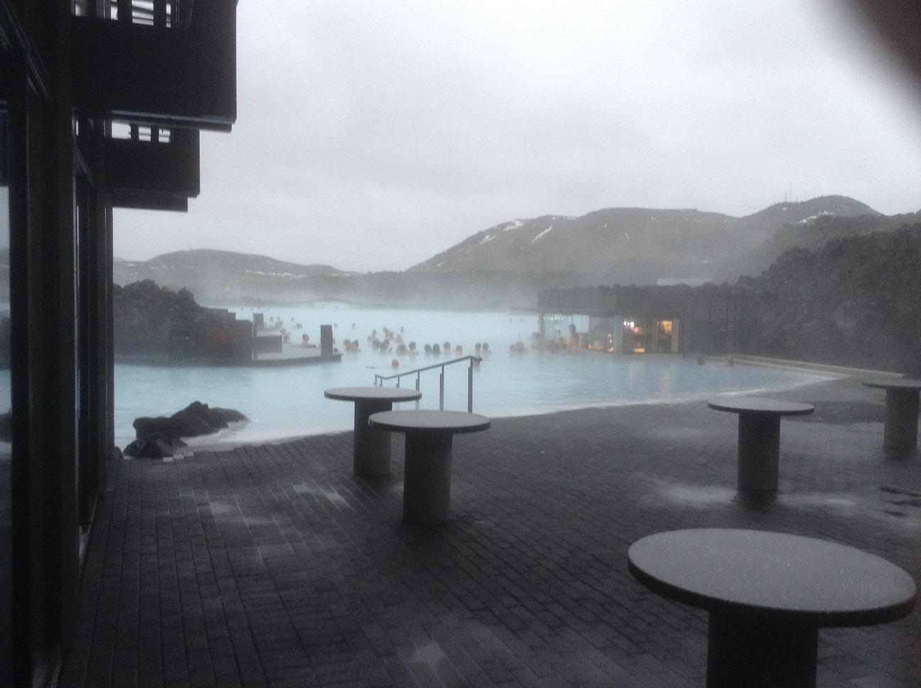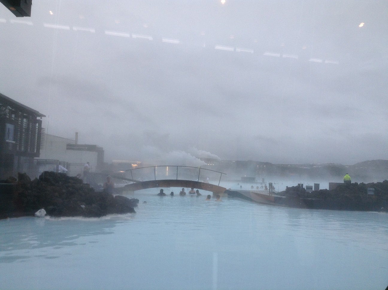 After a long wait at the airport it was time to go outside and catch the bus for the Blue Lagoon. GADZOOKS!! We had a sudden introduction to the winter weather in Iceland! The wind was gusting with hurricane force and icy cold rain was blowing horizontally. Soon we joined about 1000 other tourists all trying to stay dry and get on the busses bound for downtown Reykjavik and the lagoon. Soon the busses dropped us off and we were dragging out luggage in the dark, wind and rain to the lagoon check in and baggage storage. Finally, in our bathing suits we made the mad dash outdoors and into the warm water.