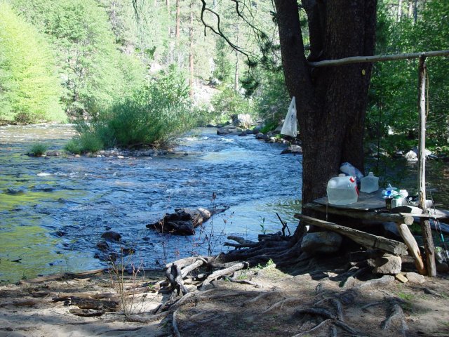 The ride in took about 4.5 hours without any real problems. (well, Penny and Black Beauty did object to continuing in after they thought we should have stayed near Willow Camp). The last 0.5 miles to camp included a very steep descent (about 800' vertical) down to the river and we wisely left 3 of the horses behind while Bill, Jeanne, wrangler, 3 mules and one horse walked down. Kerry rode because of his arthritis problems.
