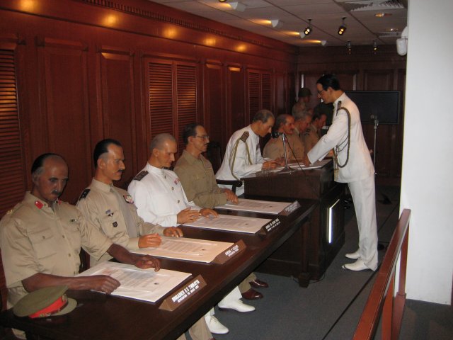 Near the end of WW2 a major Allied invasion, Operation Zipper, was planned for Sept 1945 to re-capture Singapore. Fortunately for the Allied soldiers, the operation was not necessary as the Japanese surrendered in August after the atomic bomb attacks. This surrender is also depicted in the wax figures.
