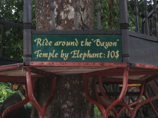 We said goodbye to Lei and the driver at noon since we had enough tours and wanted to do some stuff on our own. It was a very clear and sunny afternoon, unlike the previous rainy and cloudy days, so we decided to go check out the Phnom Bakheng temple which is on top of one of the few hills in the whole area. This temple is noted for its spectacular sun rises and sun sets and I felt challenged since Lei had earlier told me I was too old to go up the temple steps! I found out that it was Lei who did not want to go up the steps! Another attraction for us was the potential elephant ride to the top of the hill.